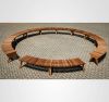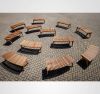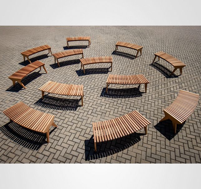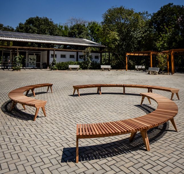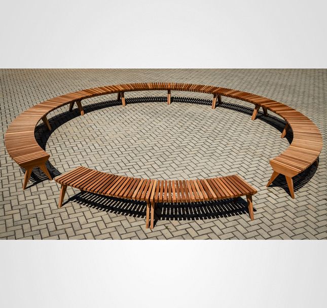 O Banco Ripado Curvo é todo em madeira maciça Freijó ou Jequitibá e foi executado em 4 partes que se juntam para formar a elipse. O desenho das pernas com recortes que se juntam e as ripas do assento foram executados pelos mestres da marcenaria requintada.