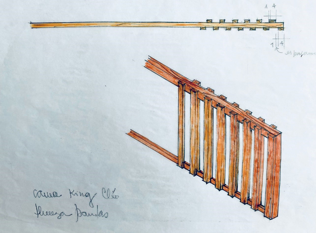Ela queria fazer uma Cama diferente para a cliente dela e que tivesse um movimento vazado na madeira maciça para sobrepor o revestimento na madeira mais clara da parede e fez um desenho de como seria o ripado vertical, para montarmos uma amostra para a cliente aprovar: