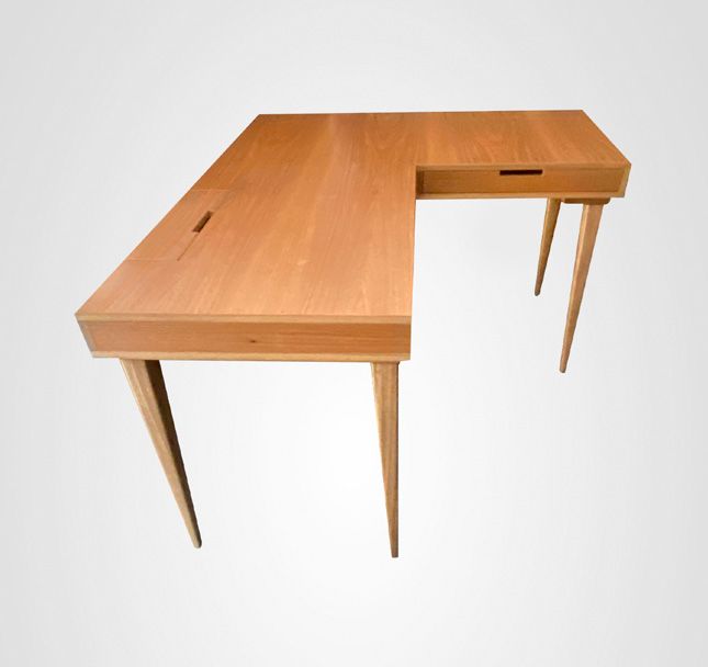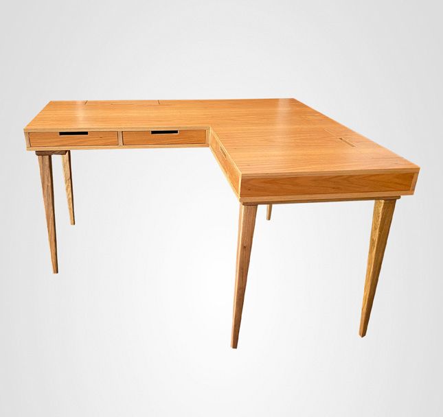A Escrivaninha em formato L com pernas Taco em madeira maciça Freijó e caixa reta com 3 gavetas e 2 caixas embutidas para passagem dos fios que auxiliam na organização. A execução da marcenaria é artesanal e generosa na utilização dos materiais de qualidade.