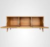 Rack com pés Taco em madeira maciça e caixa em compensado de madeira natural Freijó. Seu design diferenciado combina portas basculantes com o ripado aberto, pensado para facilitar a utilização e manuseio dos aparelhos eletrônicos, e o ripado fechado, ideal para a organização dos objetos.