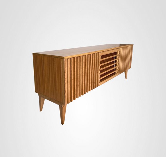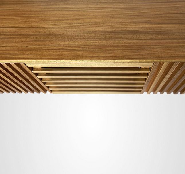 | Materiais | Pés Taco e ripados em madeira maciça e caixa em compensado de madeira natural Freijó. |